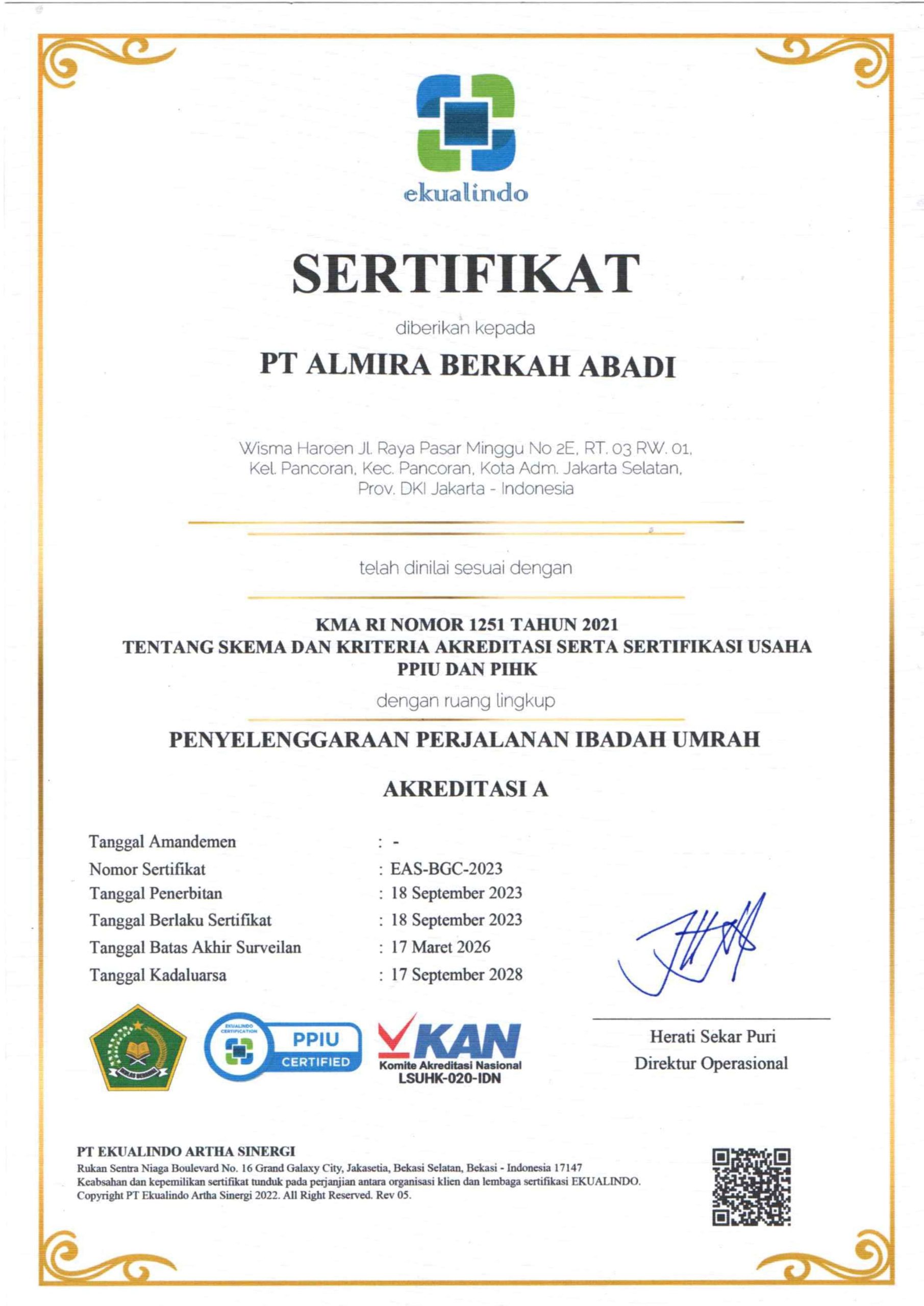 Almira Travel merupakan Travel Umroh yang telah memiliki izin resmi sebagai Penyelenggara Perjalanan Ibadah Umroh (PPIU) dari Kementerian Agama RI dengan Izin Umroh No. 521 Tahun 2019 Izin Haji No. 767 Tahun 2023.